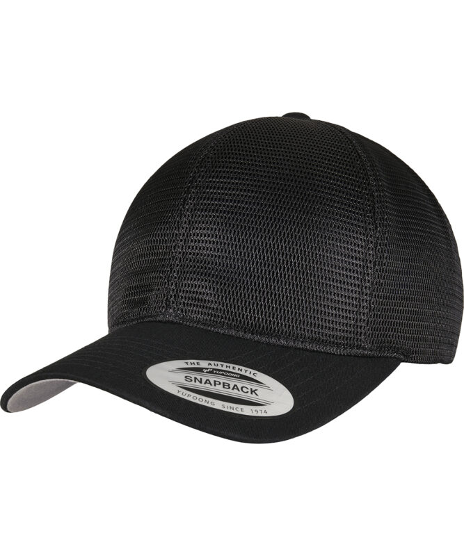 Omnimesh cap with color-matching snapback closure, one size fits all, made of cotton and polyester, breathable material, 8-fold quilted, pre-bent visor.