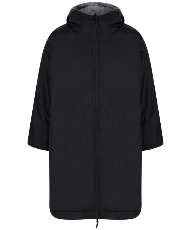 The ultimate team robe is made in a water-resistant fabric with a cosy sherpa fleece lining and three-piece hood. One size fits all, the roomy fit with double-ended full front zip allows wearers to keep warm and get changed underneath the robe. Perfect for wild swimming or wearing on team sidelines. Zipped pockets with fleece lining keep hands warm with multiple inner pockets for keeping belongings safe. Topped off with a large embroidery zip for access to directly decorate.