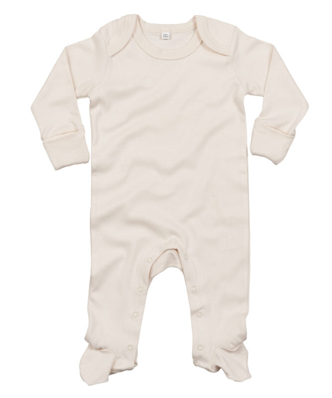 Envelope neckline. Scratch mitts which can be folded or unfolded as wanted. Integrated feet. Self-coloured poppers at neck. Tear-off label. Oeko-Tex certified. Organic 100 Content Standard certified.