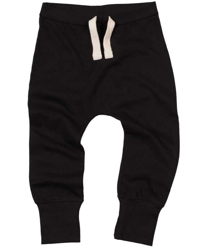 Loose fit baby sweatpants with brushed inner and dropped crotch styling for a modern look. Seam free at front and back body for increased decoration potential. Oeko-Tex certified.