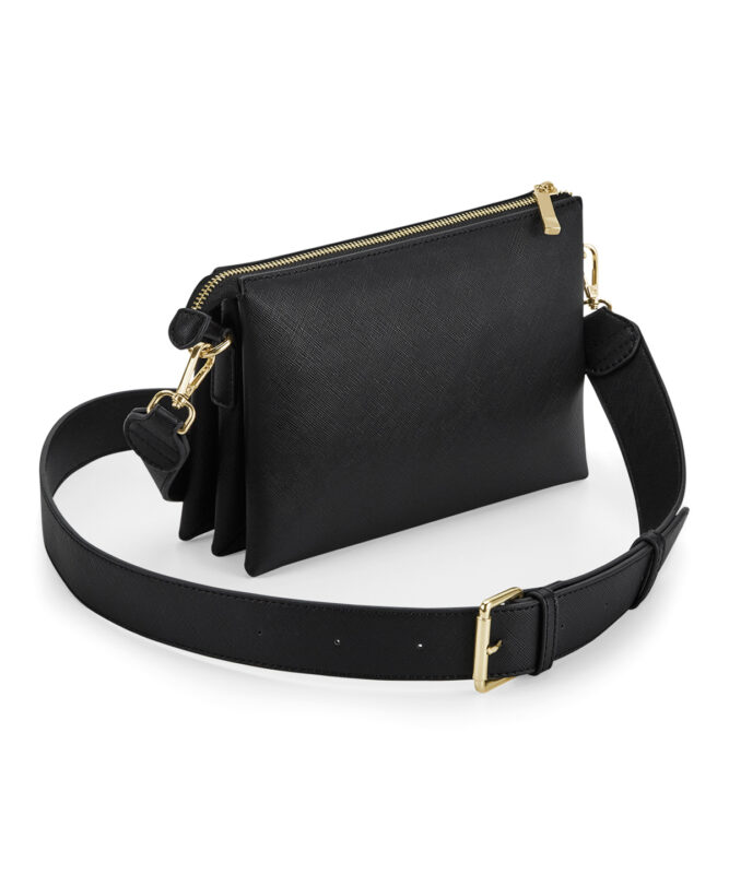 100% Leather-look PU. Saffiano fine grain. Internal pockets and dividers. Zipped main compartment. Zipped internal valuables pocket. Soft-touch lining. High-shine gold metal zip. Detachable adjustable shoulder strap. TearAway label for easy rebranding.