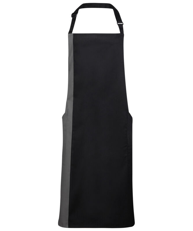 Classic Premier bib apron with contrast coloured panel. Self fabric neck. Self fabric ties 90cm long, width 72cm, length 86cm. 60°C domestic wash. Sliding adjusting buckle. Two front side pockets with slanted opening.
