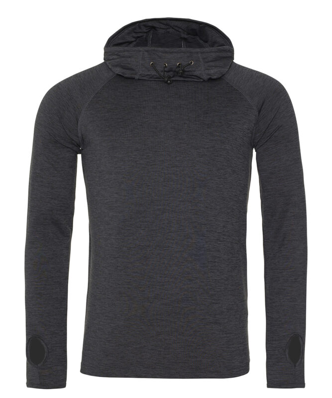 AWDis’ own CoolFit blended fabric containing elastane that provides stretch for comfort and a great fit. Cowl neck style hood. Sporty fit. Ideal for layering. Raglan sleeve design creates ease of movement. Reflective elements on hood for low light conditions. Reflective tab on back of neck helps keep ear phone cords in place. Toggled hood. Flat-lock stitching detail. Thumb hole opening. Simple tear off label makes it perfect for rebranding.