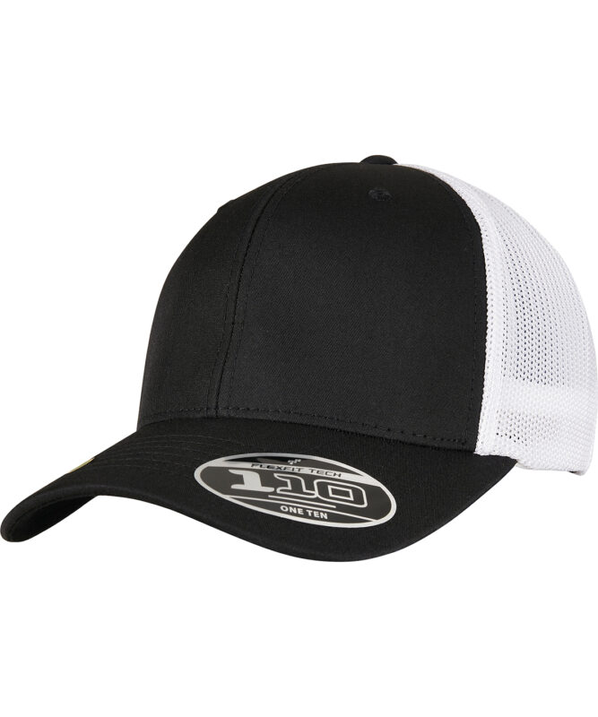 The two-tone trucker cap brings together what belongs together. Both the transparent mesh on the back and the opaque front of the cap are made of recycled polyester, combining a trendy look with a clear conscience. For providing a classy look, the cap comes in black and white. Naturally, it also features a pre-bent, eight-fold stitched visor. Excellent wearing comfort comes through the consistent use of two technologies: integrated Flexfit ribbon and a colour-matched snapback closure for individual size adjustment.