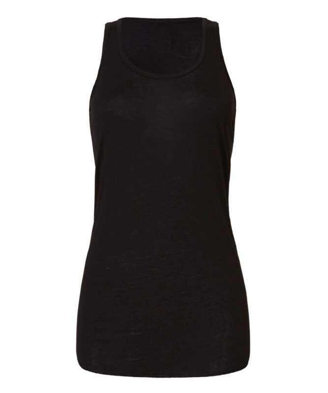 Merrowed bottom hem. Sheering at racerback seam. Racerback. Side-seamed. Easy, drapey fit.