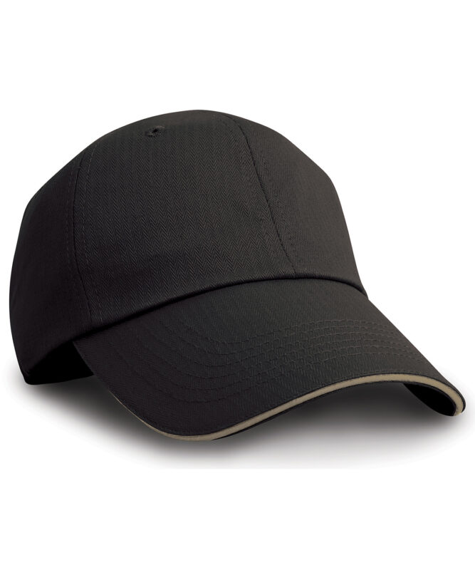 Herringbone weave. 6 panel. Low profile. Unsupported front panels. Pre-curved peak with 6 stitch lines. Contrasting colour sandwich peak. Stitched eyelets. Fabric size adjuster with antique brass buckle.Decoration Guidelines:Decorating methods: Embroidery & Transfer print Decorators access point: Open.