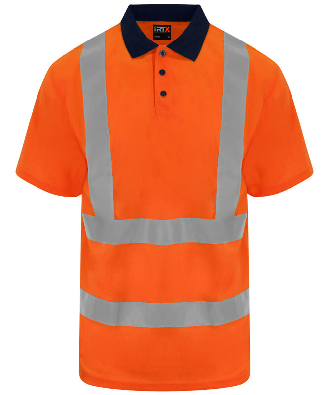 Certified EN ISO 20471:2013+A1:2016. RIS-3279-TOM ISSUE 1:2016 (Orange only). HV Orange/Navy & HV Yellow/Navy - Class 2. Ribbed contrast colour collar. 3-button placket, contrast colour buttons plus 1 spare. Twin-needle stitching on shoulder. Twin-needle stitching on sleeve and bottom hem. Side seam vents. Over shoulder and around body reflective tapes. Around body tape finishes before the side seam for comfort and ease of fit.