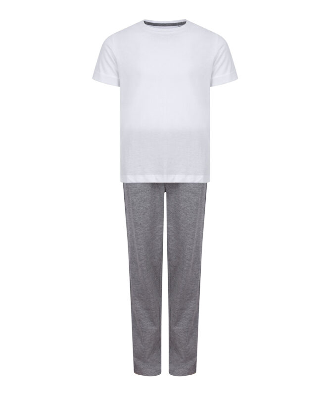 Short-sleeved t-shirt and long pant pyjama set. Crew neck t-shirt with turn up sleeves. Elasticated waistband on pants with mock herringbone drawcord.