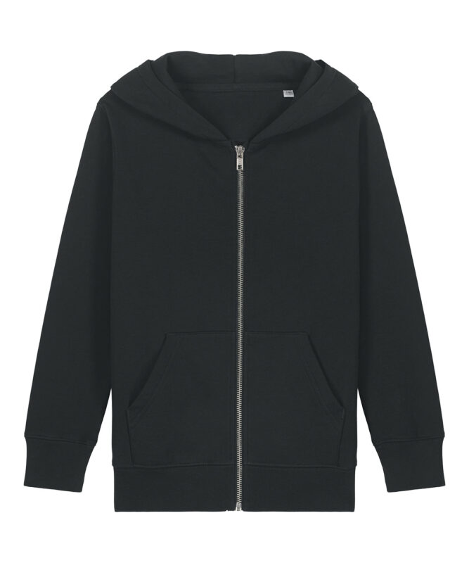 The iconic kids’ zip-thru hoodie sweatshirt. Medium fit. Set-in sleeve. Self-fabric lined hood. 1x1 rib at sleeve hem and bottom hem. Twin-needle topstitch centred on seam at hem, cuff and armhole.