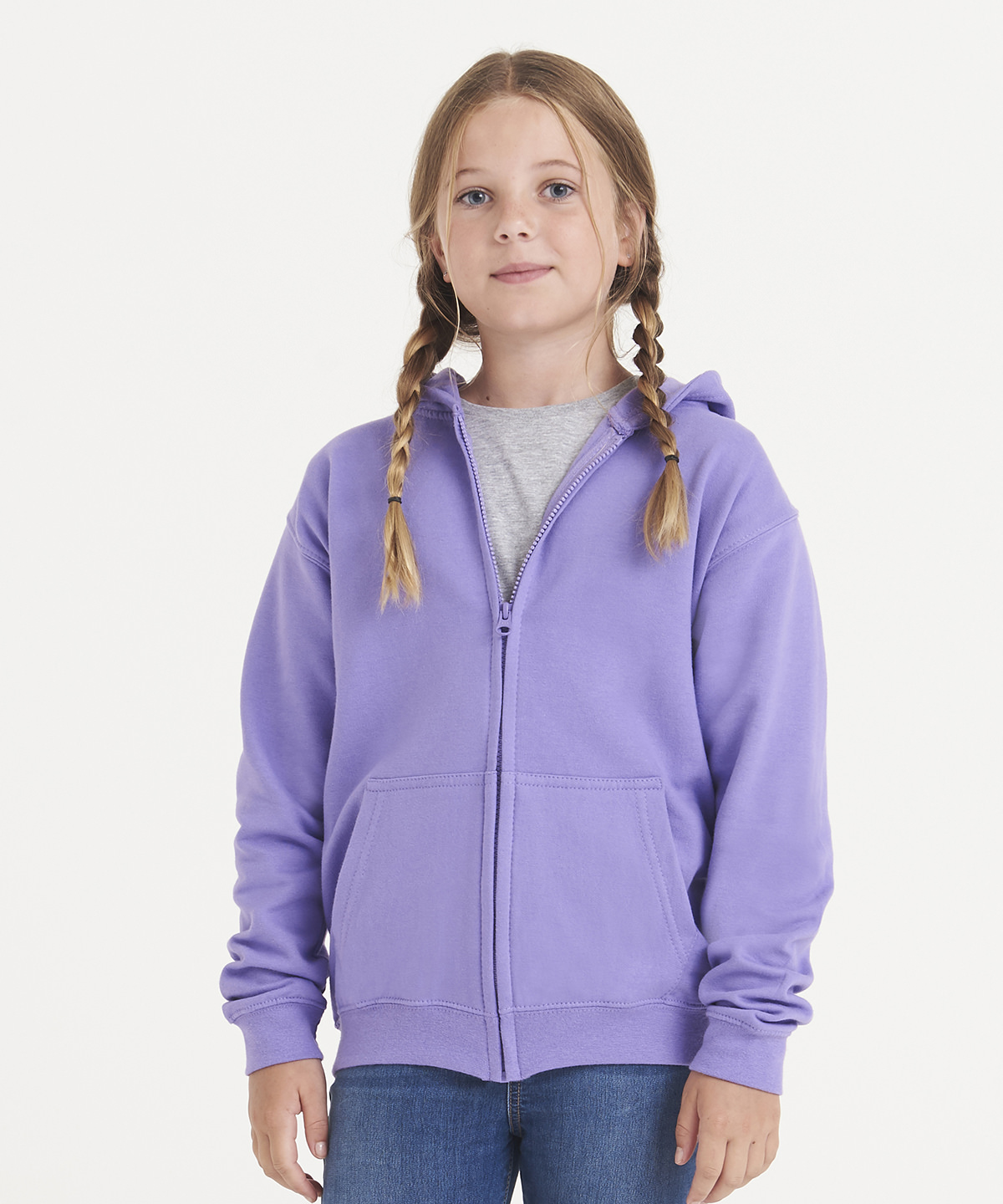 This bold hooded top for kids is ideal for sports and dance classes. Designed with comfort in mind, it features a full zip and is crafted with a soft cotton faced fabric ideal for decoration purposes.