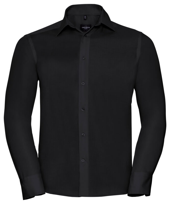 Made from a new type of non-iron fabric that stays wrinkle free and keeps the wearer looking smart all day long. Contemporary tailored cut with modern stiffened, semi- cut away boned collar. Mitred cuff, adjustable with two buttons and with option for cuff links. Without chest pocket. Rounded hem.