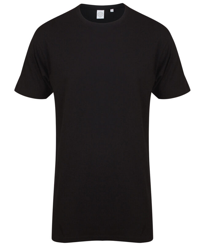 Tear-out SF (Skinnifit) label. Regular fit at chest and shoulders. Extra-long length, with longer dipped hem at back. Twin-needle stitching. Stretch rib neck.