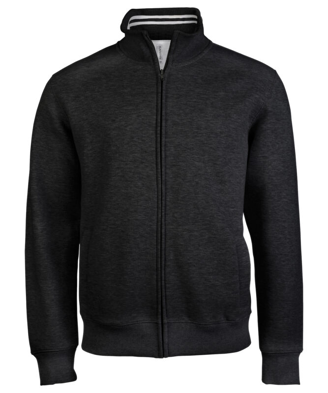 80% combed cotton/20% polyester. Low shrinkage brushed fleece. Silicone wash. Fitted style with ribbed side panels. Matching neck tape (except for White body where neck tape is Oxford Grey). Contrast striped ribbed inner collar (White for all colours, except for White body where stripes are Oxford Grey). 2 front pockets. Ribbed cuffs and hem. Zip fastening. Certified STANDARD 100 by OEKO-TEX® N° CQ 1007/8, IFTH.