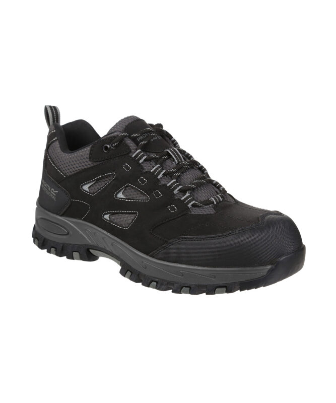 The Mudstone safety shoes, from Regatta Professional, make sure nothing gets in the way of hard work. These men’s work shoes are made from a PU nubuck with breathable mesh upper, providing a lightweight and comfortable fit. They have steel toecaps to protect from hazards and come with a water-resistant upper to keep rain at bay, plus an oil-resistant outsole to prevent slips. The flexible midsole provides all the comfort you’ll need. Fit and remove with ease with the heel pull. Conforms to EN20345: 2011 – SB