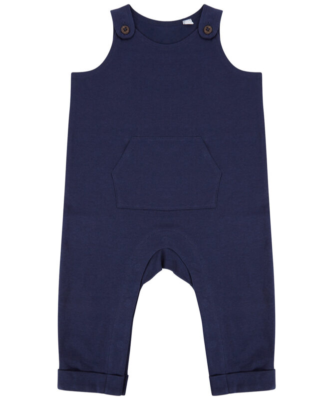 Cotton dungarees made in sustainable fabric with horn-button shoulder fastening. Central kangaroo pocket. Rolled and stitched leg hems with integral poppers around the inseam. Single Jersey facing. Tag-free.