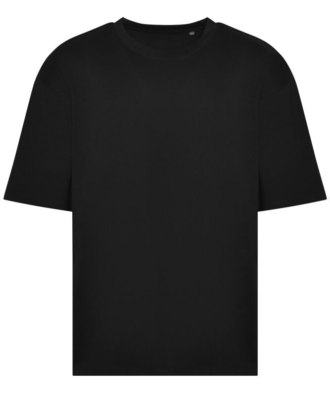 Oversized fit with side seams. Short sleeves. Ribbed crew neck style, with taped neck. Set-in sleeve. Size label only, for easy rebranding – colour-coded black for unisex. Combed ringspun cotton for ultra comfort. Surface excellent for print or embroidery. Twin-needle stitching detail on sleeves and bottom hem.