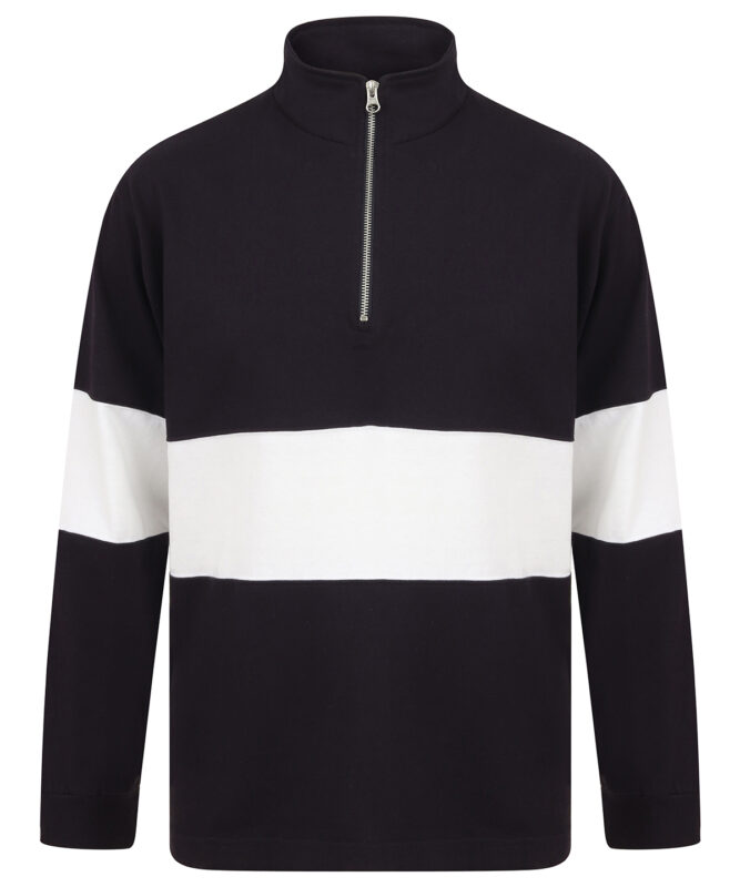 This tag free 1/4 Zip from Front Row and Co. is perfect for everyone from fashion brands to traditional clubs. Made from high quality heavyweight Jersey, this on-trend panelled top has a self-fabric funnel neck, YKK silver metal zipper and stepped hem. Tag free and ready to display a bold slogan, logo or crest. The front row in rugby; the front row in fashion.