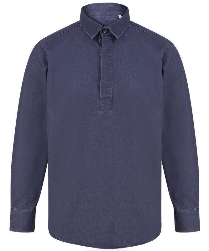 Long-sleeved plain drill shirt. Pullover with concealed button fastenings. Heavy garment wash. Adjustable button cuff and placket. Shaped hem. Back neck hanging loop. Back neck buggy. Self-fabric vent inserts. Tag-free for easy rebranding.