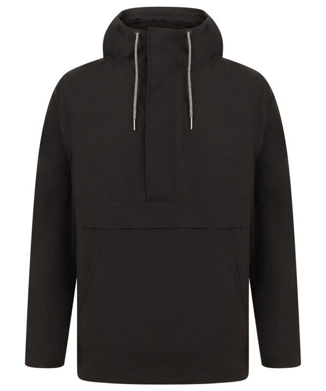 Hooded pullover jacket. Regular fit. Chest panel, front and back. Showerproof fabric, with mesh lining. Part-elasticated cuffs. 3-piece hood. Functional contrast lace drawcords around hood. Coated metal eyelets at hood opening. Centre front half- zip opening. Textured zip puller, with cord. Self-fabric storm flap, with hook and loop fastening. Elasticated cord through inside hem, with plastic toggles. Side-seam zip-opening, left hand side as worn. Large kangaroo style pockets. Inside patch pocket (with hook and loop fastening). Internal embroidery access. Back neck hanging loop.