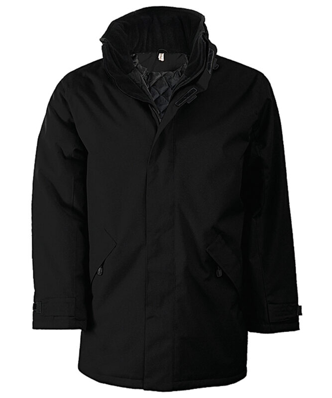 100% polyester Oxford outer – quilted polyester padding and lining. Zip fastening with tear release fastening and concealed press studs. 2 zipped outer pockets. 2 inside pockets (1 mobile phone pocket). Concealed hood. Fleece-lined collar. Zip access for decoration.
