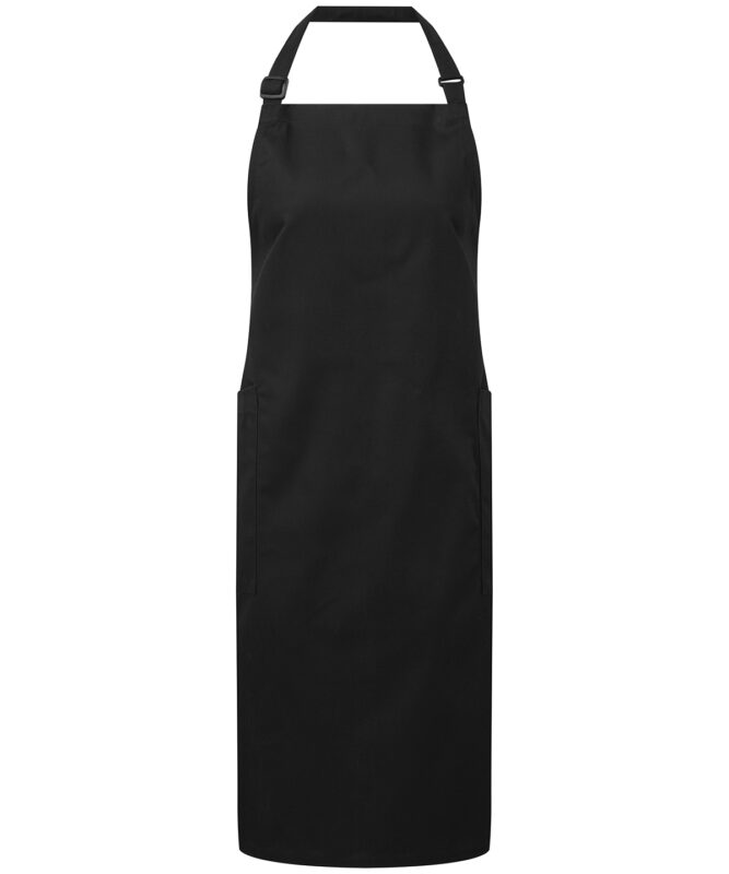 A heavyweight full length bib apron made from a combination of certified recycled polyester and certified organic Fairtrade cotton. Featuring two slanted side pockets and fully height adjustable with a buckle on the neckband. Two slanted side pockets measuring 24cm depth by 18cm wide. Adjustable buckle with gun metal finish. 86cm long x 72cm wide with 90cm long ties.