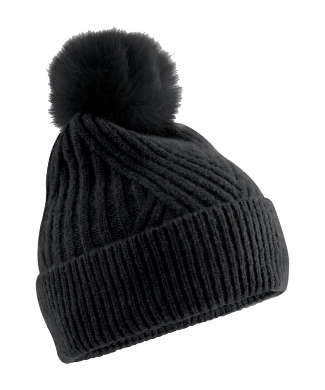 Sumptuous heavy ribbed knit. Soft-touch fabric. Retro styling. Luxury faux fur pom pom. Cuffed design for optimal decoration. TearAway label for easy rebranding.