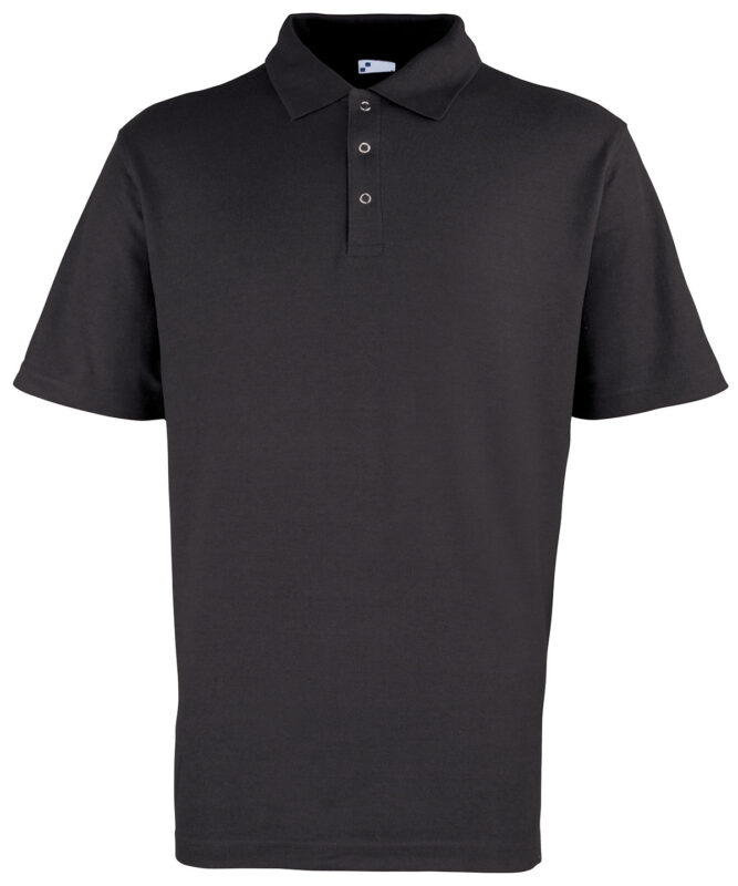Heavyweight pique polo shirt with 3 rust-free studs on placket. Covered seams across shoulders and down arms, extra body length. Knitted collar.