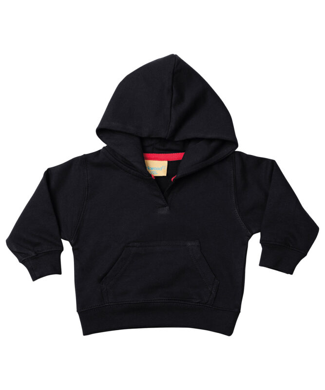 Hooded sweatshirt with placket detail at front neck. Contrast taping inside neck seam. Single jersey in hood. Kangaroo pocket. Knitted rib at cuff and hem. Twin needle stitching.