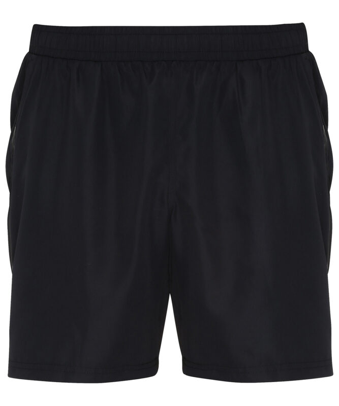 Wicking fabric. Elasticated waist. Woven fabric. Mid thigh length. Lightweight. Black heat seal tape detail on the front. Inside leg- 18cm. We recommend using block out vinyl and inks.Product contains no branded neck or waist label. Removable Kimble or looped garment tags. Inner seam label holds important product information on one label with a second label containing brand information which can be cut-away.