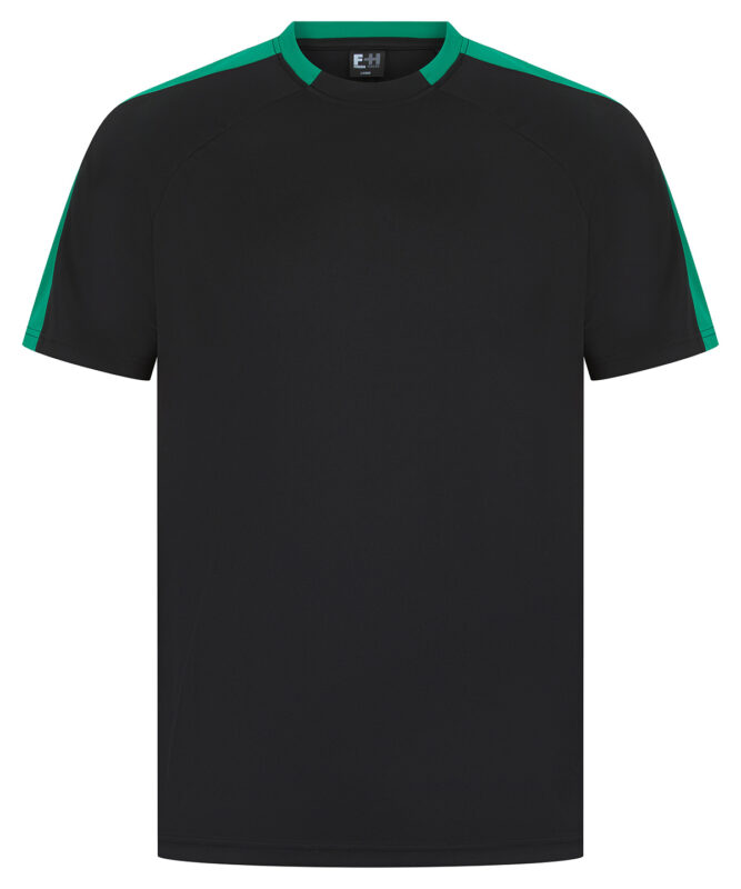 Unisex team t-shirt with self-fabric contrast colour sleeve panels. Sports fit. Wicking finish provides moisture management. Quick-dry and breathable. Self-fabric 2-piece collar. Raglan shoulder. Tear-out label for easy rebranding.