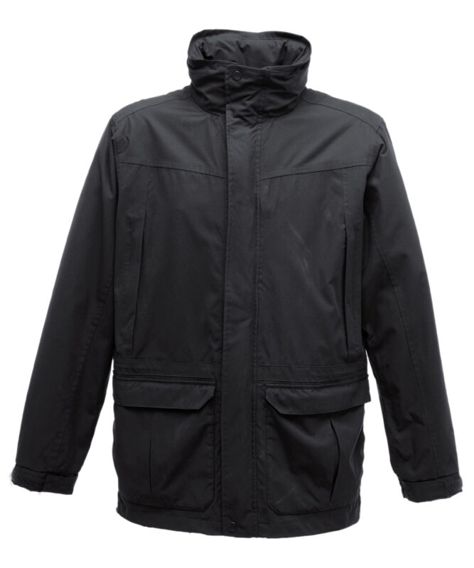 Waterproof and breathable Isotex 5000 coated polyester twill microfiber. Part mesh part polyester taffeta lined. Taped seams. Interactive Concealed hood with adjuster. Studded double stormflap. Adjustable cuffs. Internal map pocket. 2 zipped chest pockets. 2 lower patch pockets with side hand warmer entry. Internal mobile phone pocket. Adjustable shock cord waist and hem system. Internal zipped embroidery access.