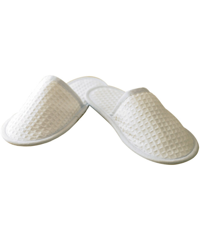 Closed toe mule slippers. Textured waffle woven fabric. Matches TC086 Waffle Robe. Mixed fibre sole.