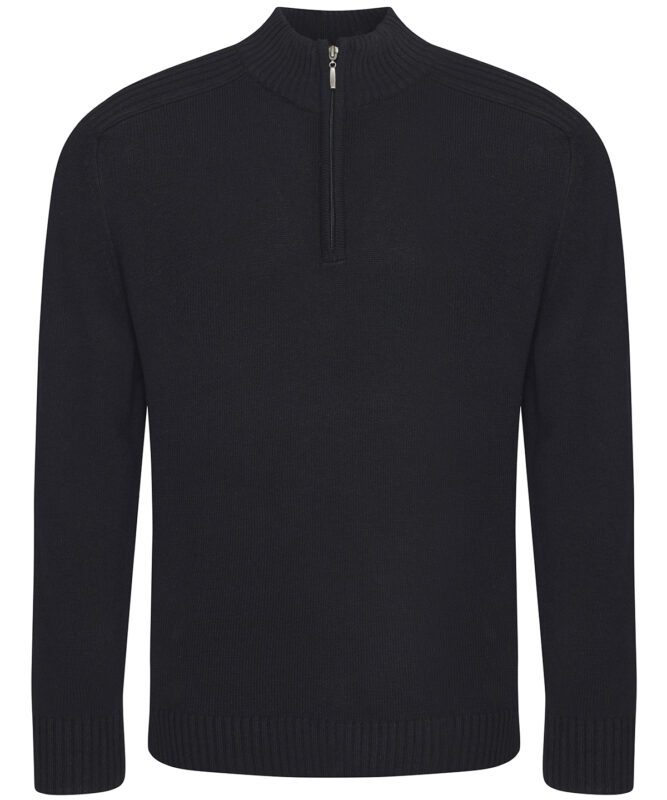 Long sleeve sweater made from regenerated cotton with tall collar and ¼ zip neck. Contrast rib stitches at shoulders cuff and hem.