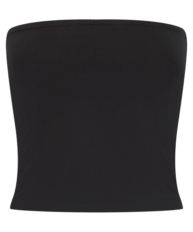 Bandeau top (strapless). Double-layer front. Silicone grip tape on front to keep garment in place when worn. Twin-needle stitching on hem. Tear-out label for easy rebranding.