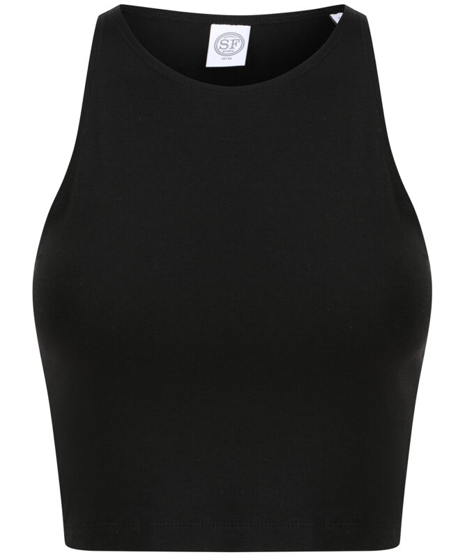 Sleeveless cropped top, with a fitted neckline that’s ultra flattering on the shoulders. High fashion. High impact. Tear-out label for easy re-branding.