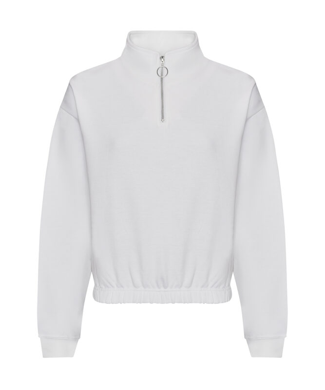 Women's regular fit. Funnel Neck. Quarter zip fastening. Cropped style. Elasticated hem. Brushed Inner fleece. Ribbed cuffs. Soft cotton faced fabric creates ideal printing surface. Simple tear out label makes it perfect for rebranding.