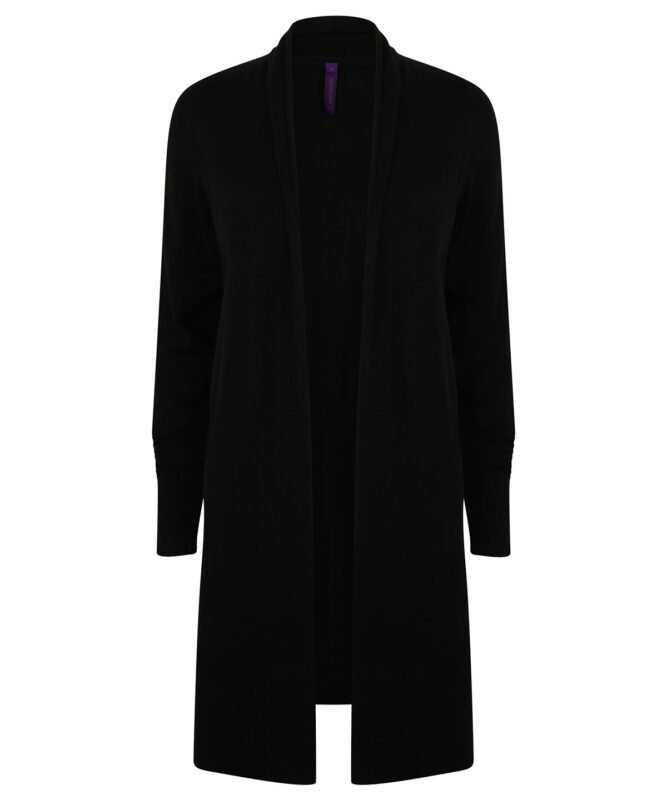 Fine knit, 12 gauge women's long line loose cardigan. Half ribbing detail on body and sleeves. Semi-fashioned sleeve. Henbury cut-out brand label. Co-ordinates with HB720 product range.