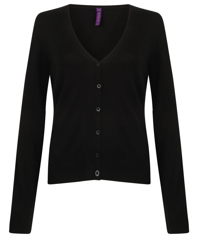 Fine knit 12 gauge short length cardigan. Semi-fashioned sleeve and neck detail. Self-coloured pearlised buttons. Set in sleeves. 1x1 neck rib, hem and cuffs. Co-ordinates with Men’s HB720, HB724, HB725 and Women's HB721. Henbury cut-out brand label.