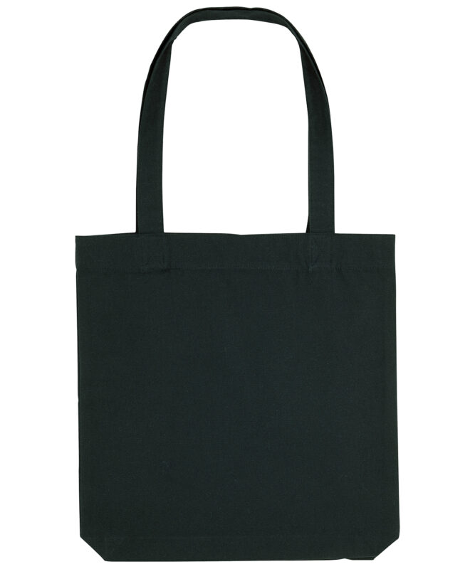 Top edge double folded for strength and clean finish. long handles with reinforced cross stitch. Shaping seam at bottom to create volume. Unisex. 80% recycled cotton, 20% recycled polyester. Canvas.