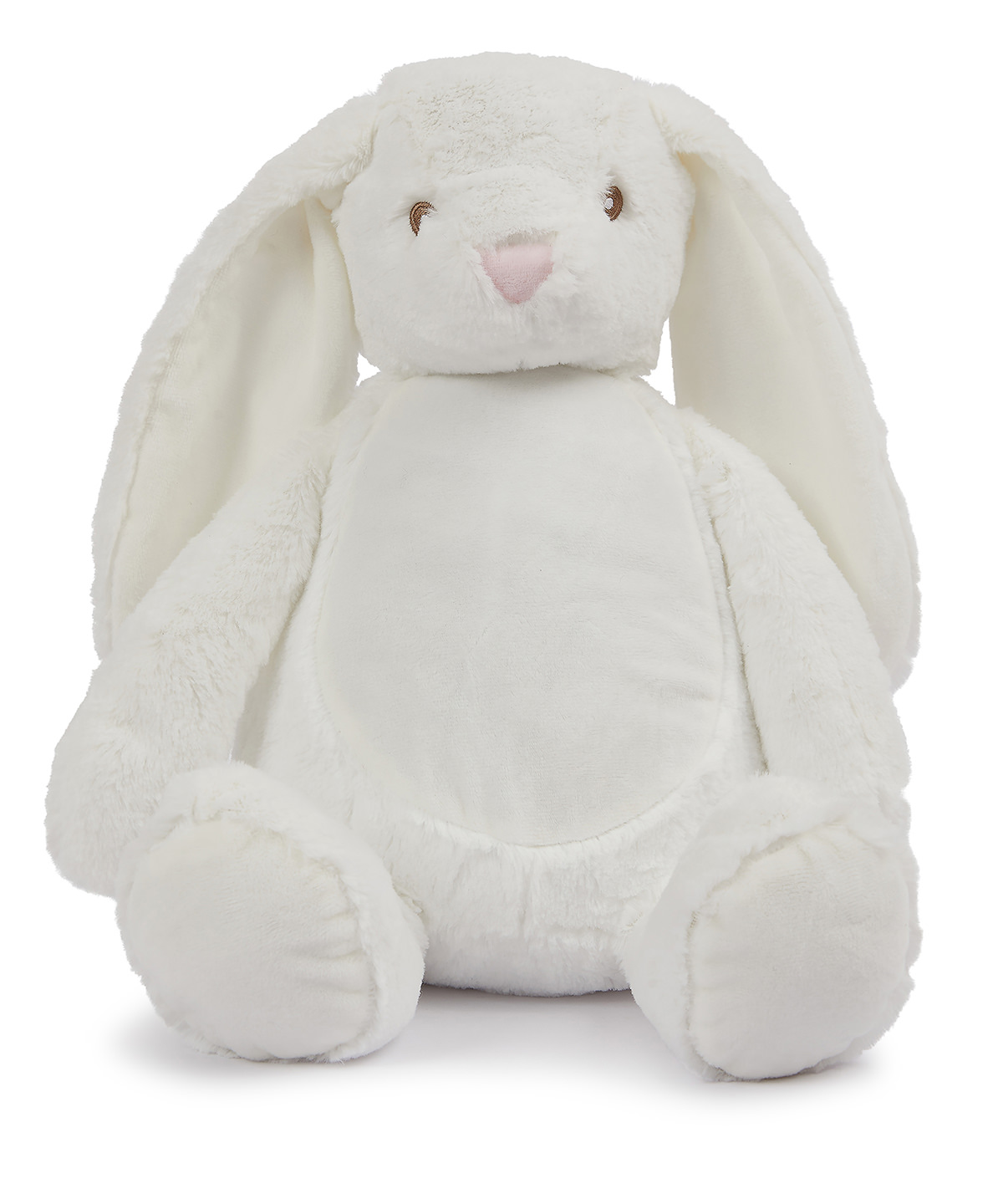 Cream coloured soft plush rabbit. Floppy ears. Contrast pink nose. Sewn eyes. Cream coloured panel on chest and feet. Zip details on the base of the Rabbit for direct access onto the tummy for embroidery. Removable inner stuffing. Complies with EN71 European Toy Safety regulations. Remove all hang tags and their fasteners before giving these items to a child. Suitable for children of all ages.