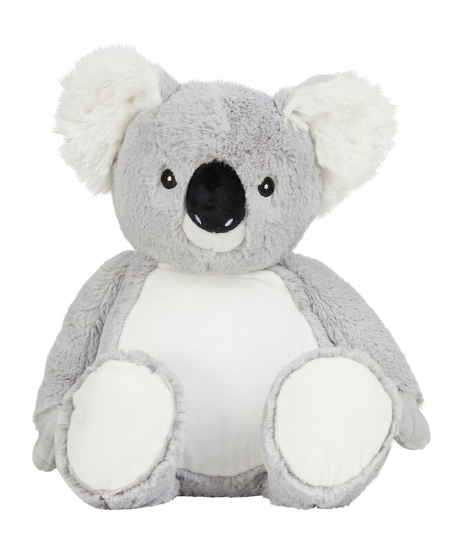 Soft plush Zippie koala bear with contrast nose and inner ears. Sewn eyes and mouth. White panel on tummy, perfect for decoration. Zip access on base for direct access onto the tummy for decoration. Removable inner stuffing. Can be embroidered, vinyl, and sublimation printed. Complies with EN71 European Toy Safety regulations. Remove all hang tags and their fasteners before giving this item to a child. Suitable for all ages.